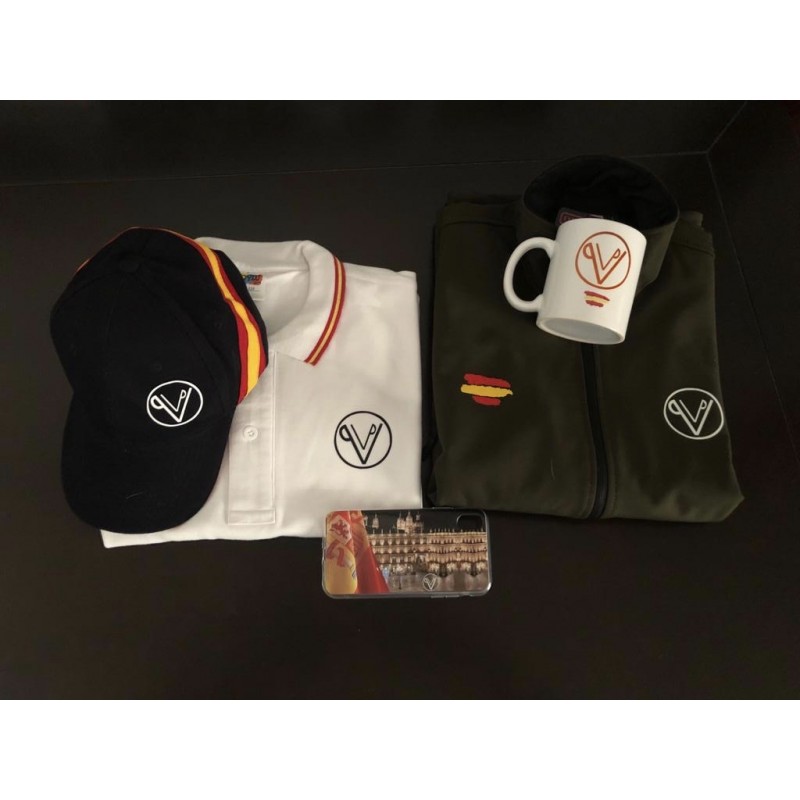 Pack completo con producto personalizados en vinilo. Contiene: Chaqueta soffshel con una personalización, polo España con una personalización, gorra, funda, taza y pegatina de coche